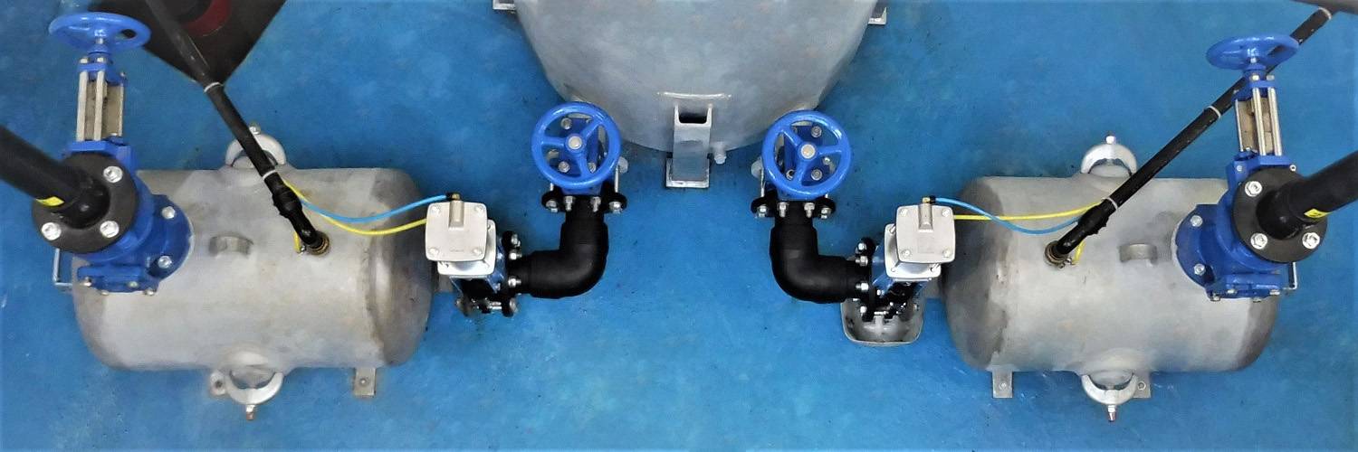 Bei kleinen und mittleren Leistungen und Drücken, z.B. für die Entwässerung von kleinen Ortschaften, werden zumeist zwei Arbeitsbehälter und zwei Arbeitsluft-Kompressoren eingesetzt.